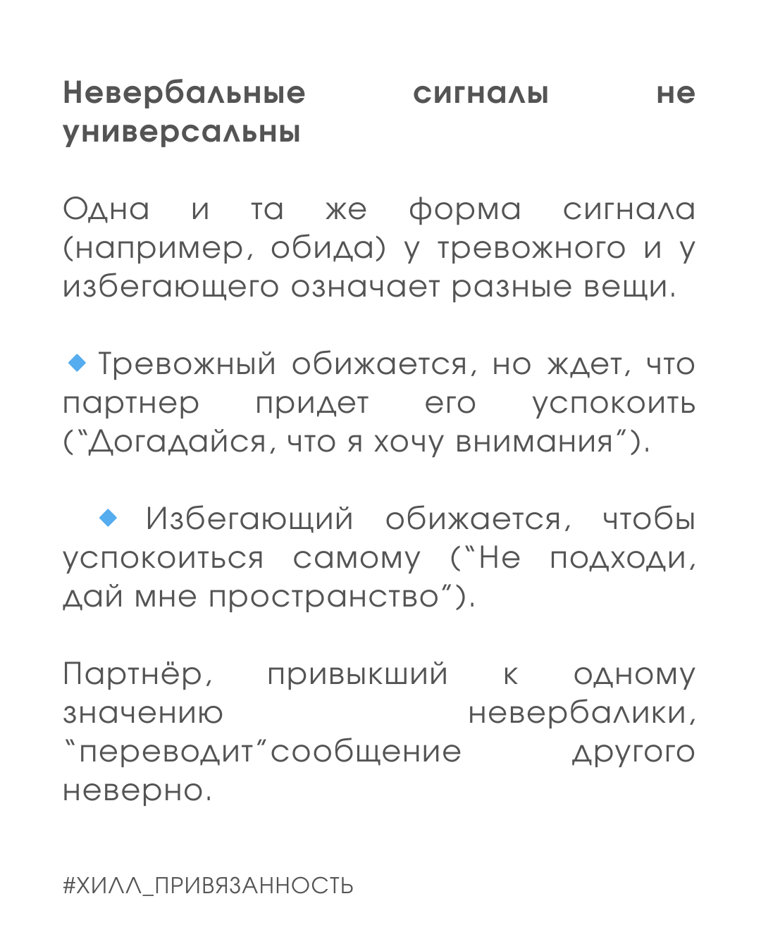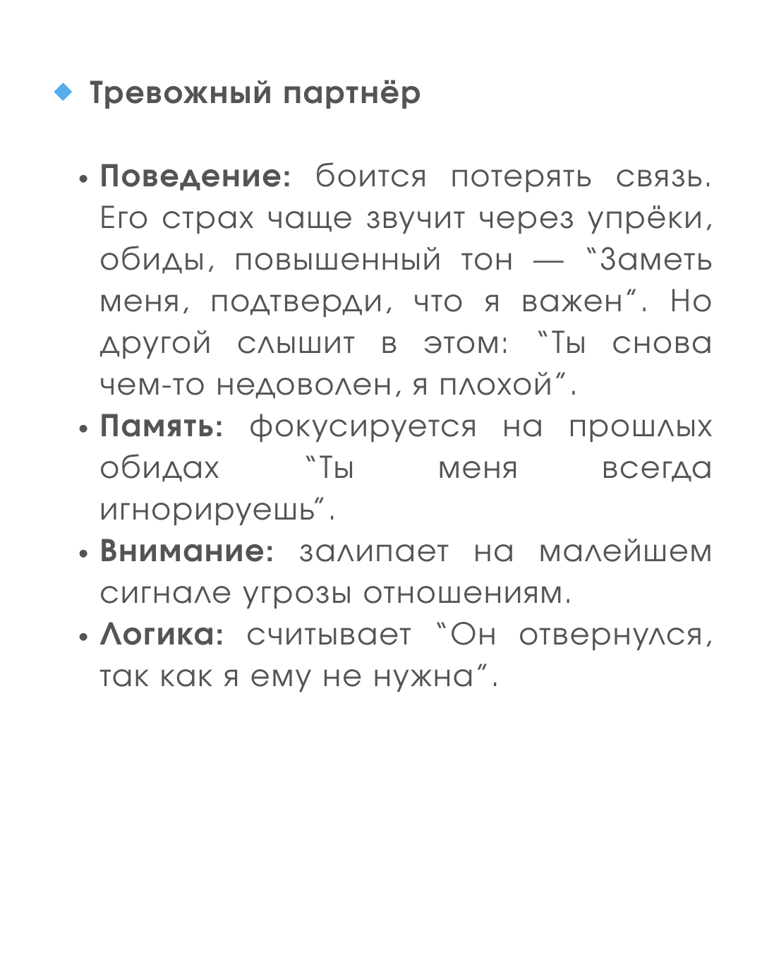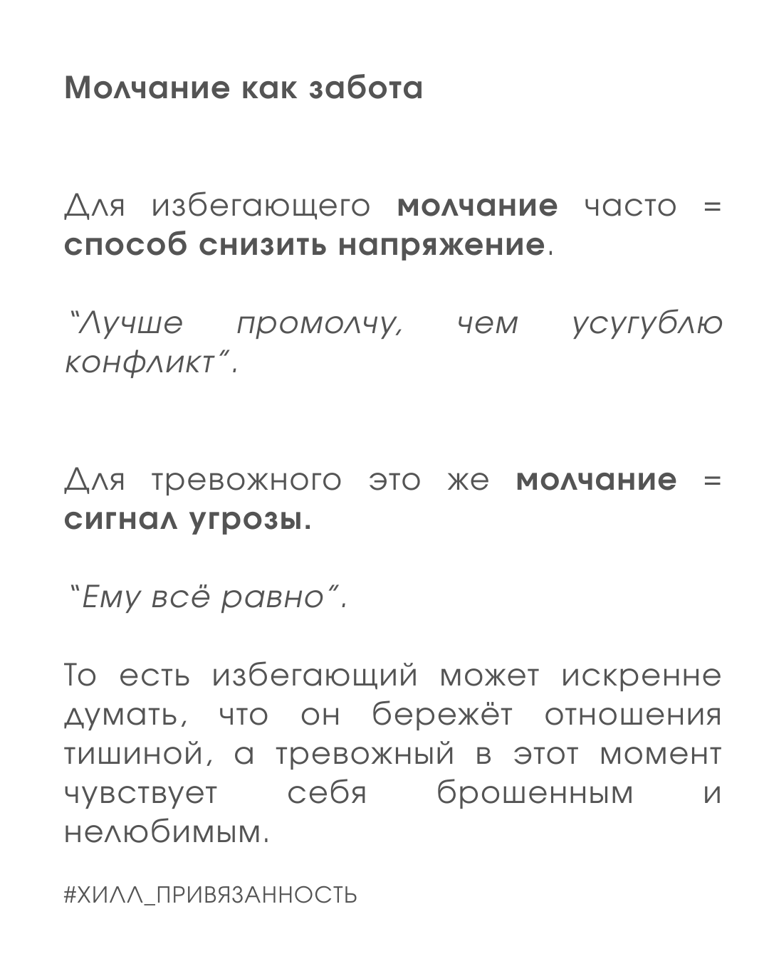 Тревожный слышит в молчании “ты меня не любишь”, избегающий — в вопросе “ты где?” слышит “ты меня контролируешь”.