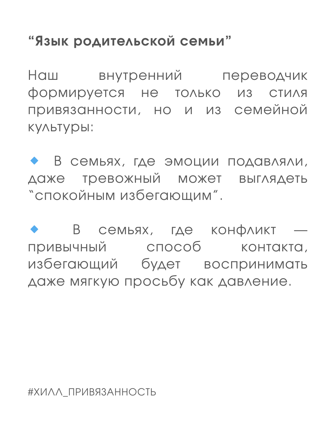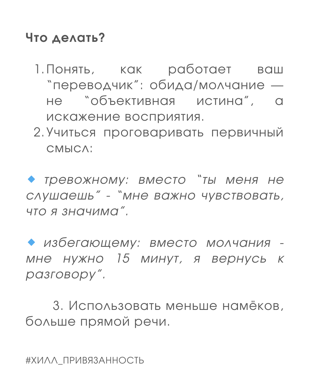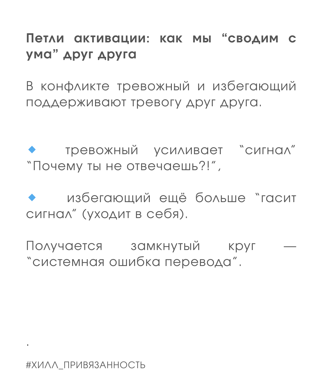 Тревожный слышит в молчании “ты меня не любишь”, избегающий — в вопросе “ты где?” слышит “ты меня контролируешь”.